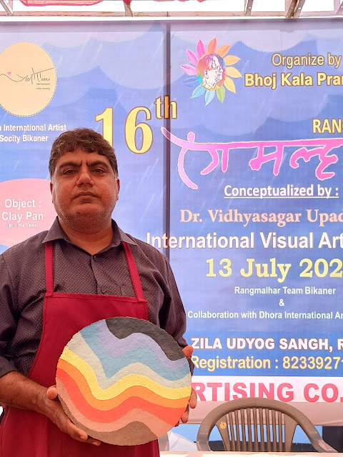 On the second day of this three-day art symposium, all the participating artists took part in a Bikaner Heritage Walk, which began at the historic Rampuria Haveli - Hotel Bhawar Niwas Haveli, located in Rampuria Mohalla, Bikaner. There, they observed firsthand the dedication of Mr. Sunil Rampuria (Art Collector), a connoisseur and patron of art in Bikaner, and his unique and inspiring interest in collecting contemporary artworks. They closely examined and appreciated the artistic creations displayed in the haveli, which was a wonderful experience for all the artists! On this occasion, Mr. Sunil Rampuria's daughter, Sneha Rampuria, also showed all the artists her art and craft work displayed in her art gallery. I also informed everyone about some of my collected artworks, which are also housed at Hotel Bhawar Niwas Haveli by Mr. Sunil Rampuria, and invited them to view them. These collected artworks include paper art and craft work, full-size artificial pots, paper sculptures (portraits), earthen pot paintings, and some mural and new design cardboard works!
