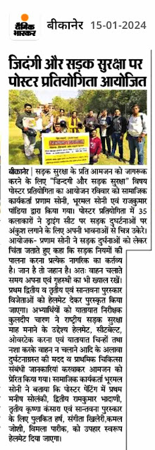 I am saying it because its live example I have lived it on Sunday date 14 Jan. 2024 in my city Bikaner . Actually I was invited for a art campaign ( poster competition art activity ) . that poster competition subject was “ LIFE & ROAD SAFETY “ . competition organizer was city police officer Madam Tejaswini Goutam and my first academic art teacher Sir Bhurmal Soni .
