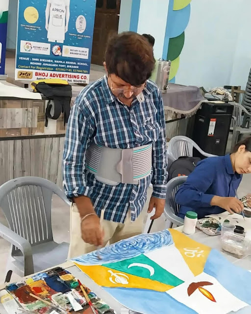 मास्टर सुनील दास रंगा ने संयोजक की भूमिका को निभाते हुए मुझे भी एक एप्रन दिया जो जयपुर से बीकानेर आये थे ! आज की एक दिवसीय रंग मल्हार शिविर में मैंने क्लॉथ पेंटिंग फॉर्मेट में वर्क किया एक्रेलिक रंगों से और मेरी अभिव्यक्ति को संयोजित करते हुए चित्रित भी किया !