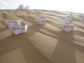 that time i were re construct a concept on heritage with critical art sound. i were designed some paper ship. point be noted paper ship is my childhood age Heritage. i were created lots of paper ship by me and then i were wrote Heritage text on all paper ship by black text and then i were created a installation art visuals on real desert. i were putted all paper ship on a desert and shoot some pictures . after shoot that pictures i were show that visuals in front of City print media and my city print media had published that with full sound of heritage with my installation visuals. here i want to share that visual image for your visit.